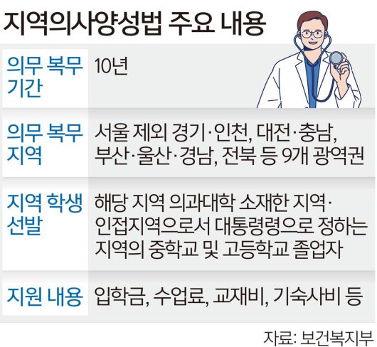 정부는 지역의사제 정원을 배분할 지역을 경기·인천, 대전·충남, 부산·울산·경남, 전북 등 9개 광역권, 44개 중진료권으로 나눴다. 서울을 제외한 32개 지역 의대에서 2027학년부터 신입생을 받을 전망이다. 지역의사 관련 입학자격 요건을 놓고는 잡음이 일고 있다. 지역의사에 지원하기 위해서는 해당 의대가 있는 광역권 고등학교를 졸업해야 하고, 중학교도 비수도권을 나와야 한다. 지역의사제로 입학한 학생은 졸업하고 의사면허를 취득한 뒤 출신 고교 소재지나 인근 시군에서 의무 복무해야 한다. 정부와 지자체는 이들을 위해 입학금, 수업료, 교재비, 기숙사비 등을 지원한다.