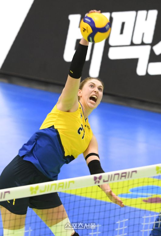 현대건설 카리(왼쪽)가 21일 수원체육관에서 열린 2025-2026 V리그 여자부 페퍼저축은행과의 경기에서 스파이크 공격을 하고 있다, 2026. 1. 21.수원 | 박진업 기자 upandup@sportsseoul.com [기사제보 news@sportsseoul.com] Copyright ⓒ 스포츠서울&sportsseoul.com