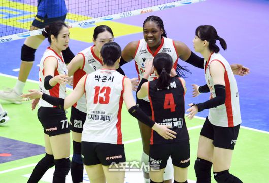 페퍼저축은행 선수들이 21일 수원체육관에서 열린 2025-2026 V리그 여자부 현대건설과의 경기에서 득점을 한 뒤 함께 기뻐하고 있다, 2026. 1. 21.