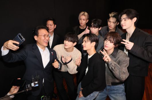 김민석 국무총리가 21일 서울 용산구 하이브 사옥을 방문해 엔하이픈과 셀카를 찍고 있다. 연합뉴스 |