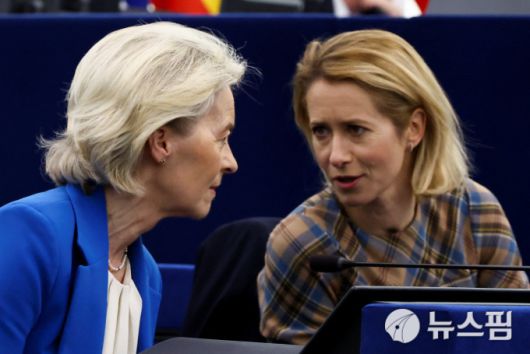 [스트라스부르 로이터=뉴스핌] 장일현 특파원 = 우르줄라 폰데어라이엔(왼쪽) 유럽연합(EU) 집행위원장이 21일(현지 시간) 프랑스 스트라스부르 유럽의회에서 연설에 앞서 카야 칼라스 EU 외교안보 고위대표와 얘기를 나누고 있다. 2026.01.21. ihjang67@newspim.com |