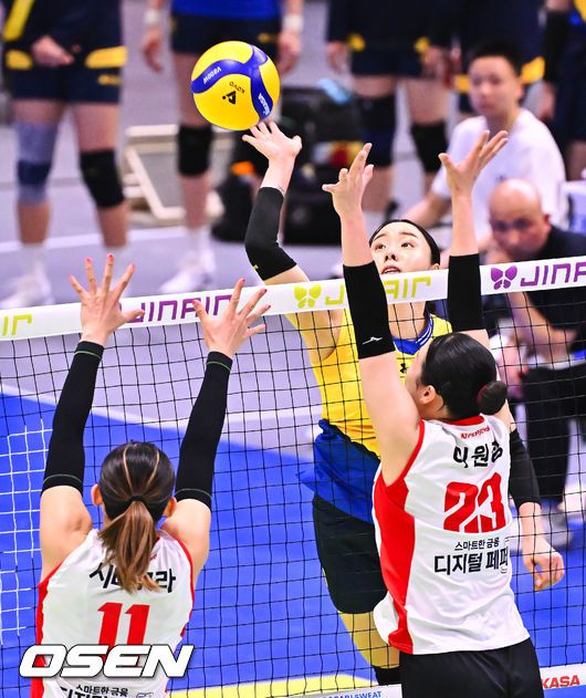 [OSEN=수원, 박준형 기자] 21일 오후 수원실내체육관에서 진에어 2025~2026 V-리그 여자부 현대건설과 페퍼저축은행의 경기가 진행됐다.