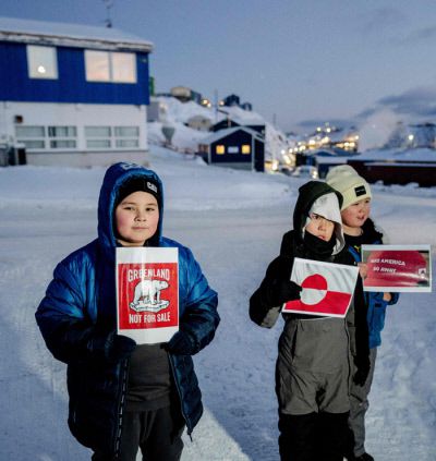 그린란드 아이들도 “안 팔아요” 20일(현지시간) 그린란드 수도 누크에 위치한 미국 영사관 앞에서 아이들이 “그린란드는 판매용이 아니다”라고 적힌 손팻말 등을 들고 있다. AFP연합뉴스 |
