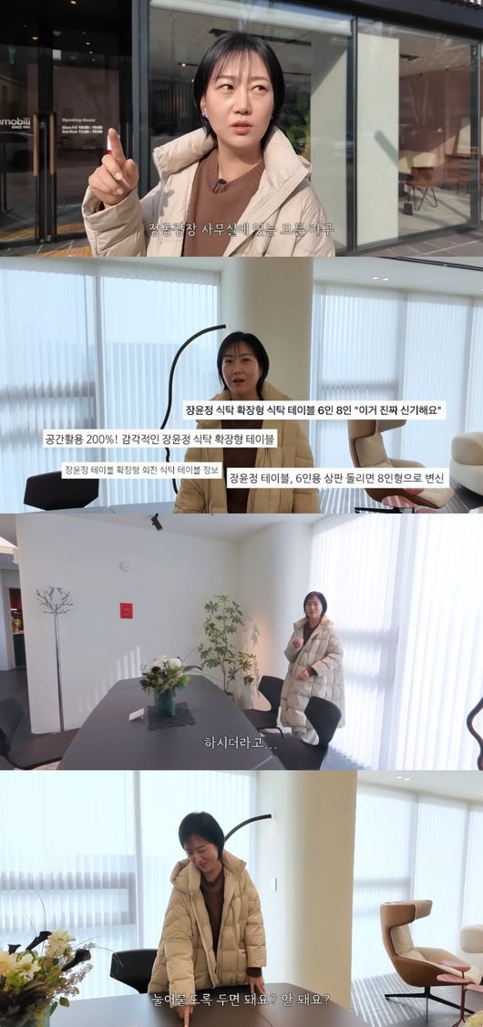 가구 편집숍을 구경하던 중 장윤정은 자신의 사무실에서 사용하는 테이블을 발견했다. 그는 “저희 사무실에 있는 책상이다. 제가 얼핏 보여드리지 않았냐”라며 “그리고 며칠 있다가 SNS에 이 제품 아닌데 막 변신하는 식탁을 보여주면서 하더라. 그거 아니다”라고 잘못된 정보를 바로잡았다.