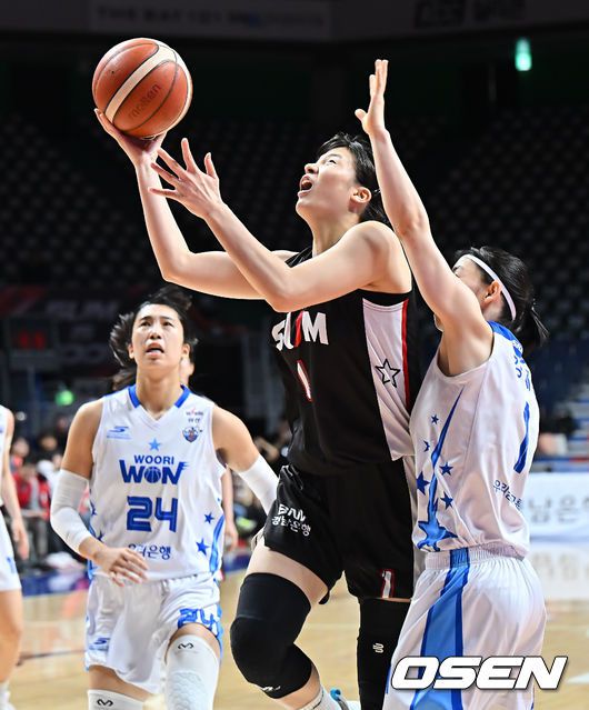부산 BNK 변소정이 아산 우리은행 강계리의 마크를 피해 골밑슛을 시도하고 있다. 2026.01.21 / foto0307@osen.co.kr