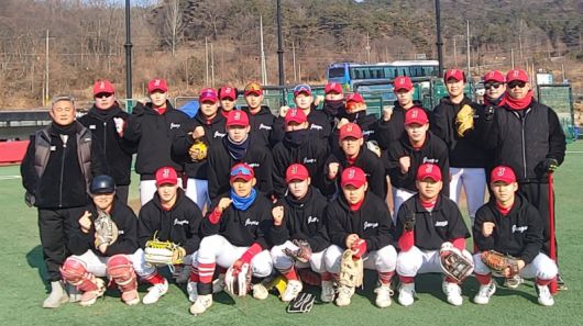순창군을 찾아 동계 전지훈련에 돌입한 수원 장안고 야구부 선수단이 훈련에 앞서 기념촬영을 하고 있다. [사진=순창군] |