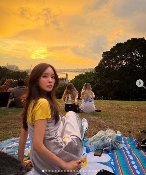 공개된 사진 속 효민은 시드니에 위치한 천문대 공원에서 돗자리를 깔고 앉아 노을 하늘을 바라보고 있다. 노란 티셔츠에 편안한 팬츠를 매치한 내추럴한 스타일링으로 꾸밈없는 매력을 드러낸 모습이다.