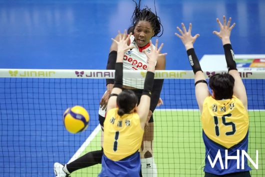 (MHN 수원, 박태성 기자) 21일 수원실내체육관에서 '2025-2026 V-리그 여자부' 현대건설과 페퍼저축은행 경기가 열렸다. 2위(14승9패) 현대건설과 6위(8승15패) 페퍼저축은행이 1-2 경기를 펼치고 있다. 페퍼 조이가 경기를 펼치고 있다. <저작권자 Copyright ⓒ MHN / 엠에이치앤 무단전재 및 재배포 금지>