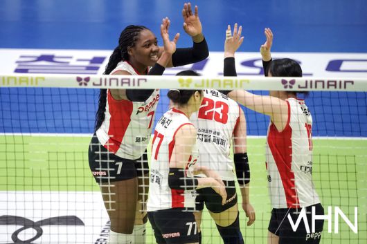 (MHN 수원, 박태성 기자) 21일 수원실내체육관에서 '2025-2026 V-리그 여자부' 현대건설과 페퍼저축은행 경기가 열렸다.