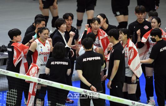 페퍼저축은행 장소연 감독(왼쪽 셋째)이 21일 수원체육관에서 열린 2025-2026 V리그 여자부 현대건설과의 경기에서 선수들과 파이팅을 외치고 있다. 2026. 1. 21.수원 | 박진업 기자 upandup@sportsseoul.com [기사제보 news@sportsseoul.com] Copyright ⓒ 스포츠서울&sportsseoul.com