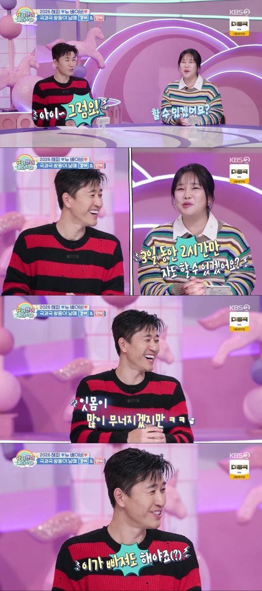 이에 김종민은 망설임 없이 "아이 그럼요"라며 자신만만하게 대답해 눈길을 끌었다. 랄랄이 다시 한번 "3일 동안 딱 2시간만 자도 할 수 있겠느냐"며 육아의 혹독함을 강조하자, 김종민은 "예. 뭐. 잇몸이 많이 무너지겠지만, 이가 빠져도 해야죠"라고 진지하면서도 엉뚱한 답변을 내놓아 현장을 웃음바다로 만들었다.