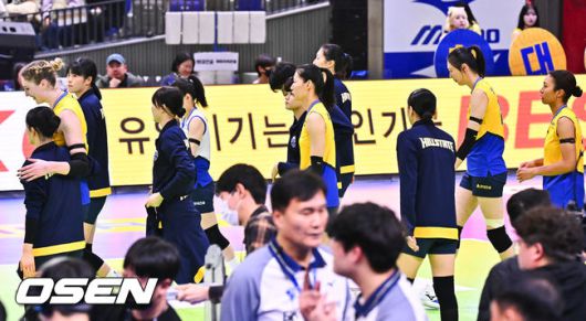 [OSEN=수원, 박준형 기자] 6위 페퍼저축은행이 2위 현대건설을 제압하고 전반기를 마무리했다. 페퍼저축은행은 21일 수원실내체육관에서 열린 진에어 2025~2026 V-리그 현대건설을 상대로 3-1(23-25, 25-15, 25-16, 25-19) 역전승을 거뒀다. 경기종료 후 현대건설 선수들이 패배에 아쉬워하고 있다. 2026.01.21 / soul1014@osen.co.kr