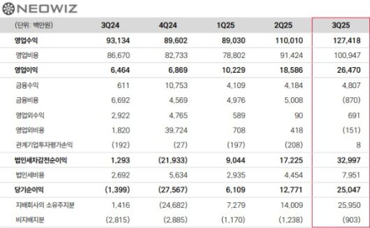 2025년 네오위즈는 분기별로 뚜렷한 성장 흐름을 이어갔다. 3분기 기준 매출은 1,274억 원, 영업이익은 265억 원으로 전년 동기 대비 큰 폭의 개선을 기록했다. 매출과 이익 모두 PC·콘솔과 모바일 부문에서 고르게 기여했으며, 특정 플랫폼에 대한 의존도가 낮아졌다는 점이 특징이다.