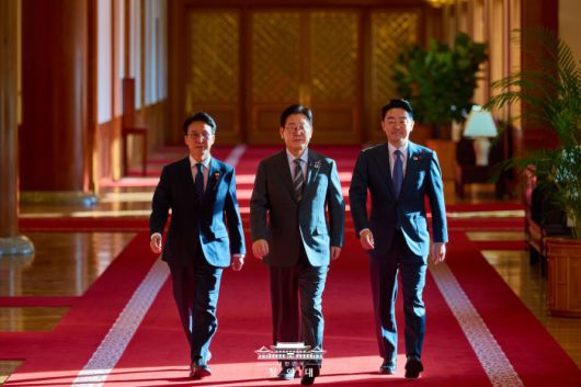 [서울=뉴스핌] 이재명 대통령이 20일 청와대에서 열린 제2회 국무회의에 참석하고 있다. 왼쪽부터 김민석 국무총리, 이 대통령, 강훈식 대통령비서실장. [사진=청와대] 2026.01.20 photo@newspim.com |