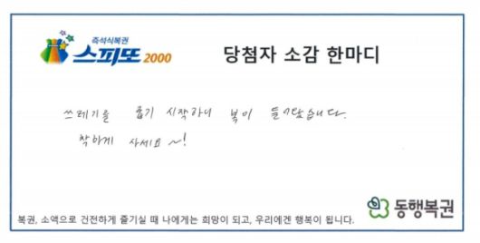 그는 "믿기지 않아 30분간 당첨 여부를 계속 확인했다"며 "최근 길거리 쓰레기를 줍는 등 착한 일을 실천하기 시작했는데, 그 덕분에 행운이 찾아온 것 같아 기쁘고 뿌듯하다. 쓰레기를 줍기 시작하고 복이 들어온 것 같다. 모두 착하게 살면 좋겠다"고 전했다.