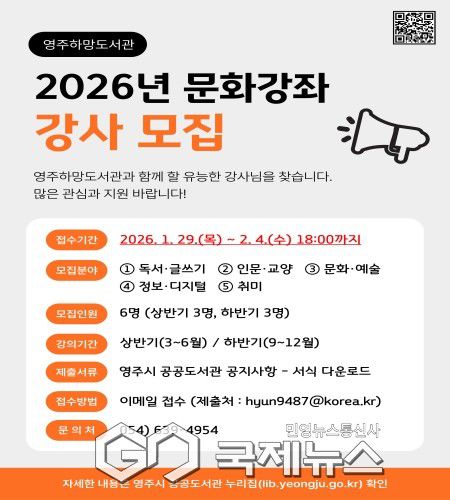 (영주=국제뉴스) 백성호 기자 = 영주하망도서관은 지역 독서문화 활성화와 시민의 문화 향유 기회 확대를 위해 다양한 분야의 전문 강사를 발굴하여 도서관 문화강좌의 질을 높이고, 지역사회와 함께 성장하는 문화 교육 기반을 조성하기 위해 오는 1월 29일부터 2월 4일까지 2026년 도서관 문화강좌를 운영할 전문 강사를 공개 모집한다.