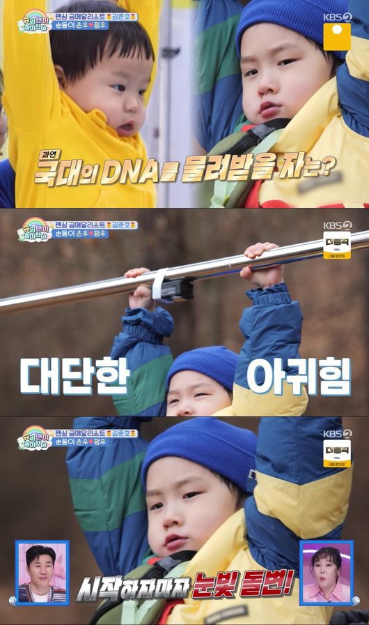 이어 첫째 은우의 도전이 시작됐다. 은우는 철봉을 꽉 움켜쥐었고, 아빠 김준호가 몸을 받쳐주던 손을 놓았음에도 불구하고 미동도 없이 매달려 있었다. 은우는 10초 이상을 거뜬히 버텨내며 4살이라고는 믿기지 않는 강력한 아귀힘을 보여주었다.