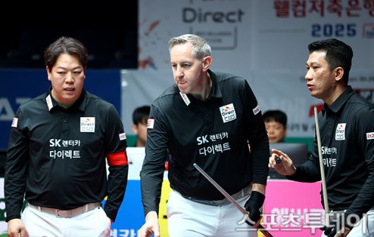 [고양(경기)=스포츠투데이 팽현준 기자] 21일 경기도 고양 킨텍스 PBA스타디움에서 열린 '웰컴저축은행 PBA 팀리그 2025-2026' SK렌터카와 하나카드의 챔피언결정전 6차전, 1세트 SK렌터카가 벤치타임을 쓰고 있다. 2026.01.21. [스포츠투데이 팽현준 기자 sports@stoo.com]
