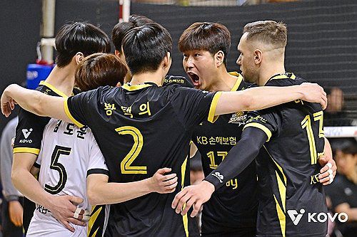 (의정부=연합뉴스) 21일 경기도 의정부체육관에서 열린 2025-2026 V리그 KB손해보험-OK저축은행의 경기에서 KB손해보험 선수들이 득점 후 기뻐하고 있다. 2026.1.21 [한국배구연맹 제공. 재판매 및 DB 금지]