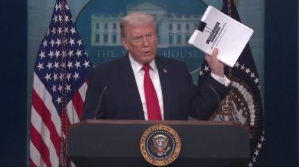 취임 1주년을 맞아 백악관 브리핑에 나선 트럼프 대통령이 '업적'이라고 적힌 두꺼운 서류 뭉치를 들어 올립니다.