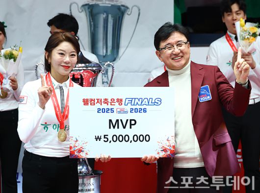 [고양(경기)=스포츠투데이 팽현준 기자] 21일 경기도 고양 킨텍스 PBA스타디움에서 열린 '웰컴저축은행 PBA 팀리그 2025-2026' SK렌터카와 하나카드의 챔피언결정전 6차전에서 하나카드가 승리하며 최종스코어 4-2로 우승을 차지했다. 김가영이 MVP를 받고 있다. 사진 오른쪽은 장상진 PBA 부총재. 2026.01.21. [스포츠투데이 팽현준 기자 sports@stoo.com]