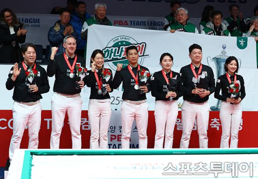 [고양(경기)=스포츠투데이 팽현준 기자] 21일 경기도 고양 킨텍스 PBA스타디움에서 열린 '웰컴저축은행 PBA 팀리그 2025-2026' SK렌터카와 하나카드의 챔피언결정전 6차전에서 하나카드가 승리하며 최종스코어 4-2로 우승을 차지했다. SK렌터카가 준우승을 차지하고 있다. 2026.01.21. [스포츠투데이 팽현준 기자 sports@stoo.com]