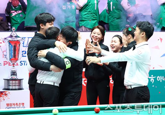 [고양(경기)=스포츠투데이 팽현준 기자] 21일 경기도 고양 킨텍스 PBA스타디움에서 열린 '웰컴저축은행 PBA 팀리그 2025-2026' SK렌터카와 하나카드의 챔피언결정전 6차전에서 하나카드가 승리하며 최종스코어 4-2로 우승을 차지했다. 하나카드 선수들이 기뻐하고 있다. 2026.01.21.