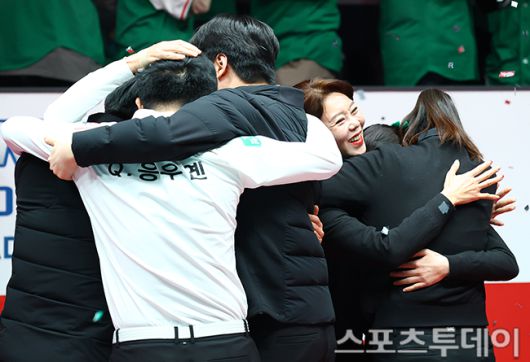 [고양(경기)=스포츠투데이 팽현준 기자] 21일 경기도 고양 킨텍스 PBA스타디움에서 열린 '웰컴저축은행 PBA 팀리그 2025-2026' SK렌터카와 하나카드의 챔피언결정전 6차전에서 하나카드가 승리하며 최종스코어 4-2로 우승을 차지했다. 하나카드 선수들이 기뻐하고 있다. 2026.01.21.
