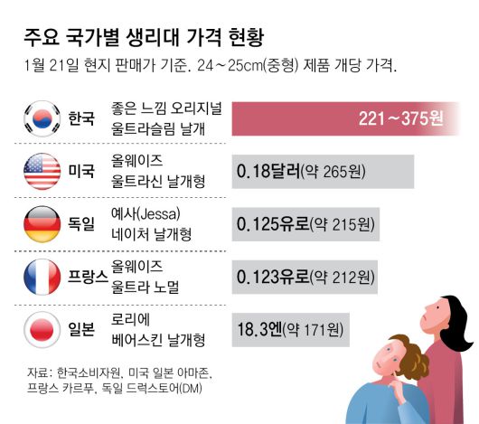 일본에서 많이 판매되고 있는 제품(로리에 베어스킨 날개형)은 개당 가격이 171원이었다. ‘좋은느낌’ 최저가와 비교하면 한국이 약 29% 높은 수준이다. 미국(올웨이즈 울트라신 날개형) 265원, 프랑스(올웨이즈 울트라 노멀) 212원, 독일(예사 네이처 날개형) 215원 등은 좋은느낌 최저가(221원) 기준으로 비슷하거나 살짝 높은 것으로 나타났다.