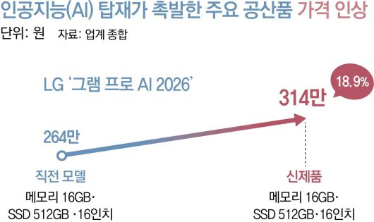 LG전자도 이달 초 생성형 AI를 적용한 2026년형 LG 그램을 공개했는데, 16인치 제품 출고가(메모리 16GB, SSD 512GB)가 314만 원이었다. 지난해 동급 대비 약 50만 원 인상됐다. 해외 업체들도 마찬가지다. 델은 지난해 12월부터 주요 제품 가격을 15∼20% 인상했다.