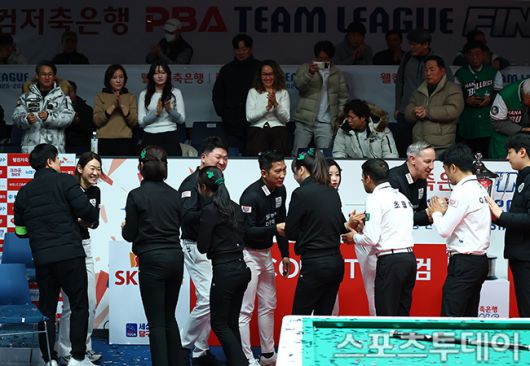 [고양(경기)=스포츠투데이 팽현준 기자] 21일 경기도 고양 킨텍스 PBA스타디움에서 열린 '웰컴저축은행 PBA 팀리그 2025-2026' SK렌터카와 하나카드의 챔피언결정전 6차전에서 하나카드가 승리하며 최종스코어 4-2로 우승을 차지했다. 선수들이 인사를 나누고 있다. 2026.01.21. [스포츠투데이 팽현준 기자 sports@stoo.com]