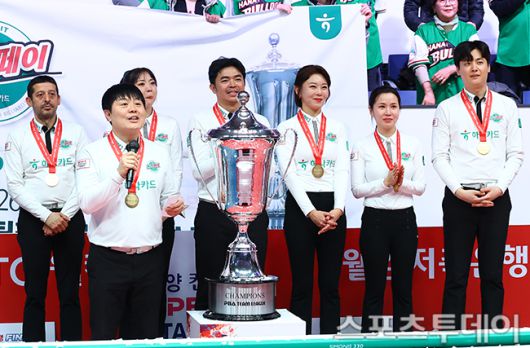 [고양(경기)=스포츠투데이 팽현준 기자] 21일 경기도 고양 킨텍스 PBA스타디움에서 열린 '웰컴저축은행 PBA 팀리그 2025-2026' SK렌터카와 하나카드의 챔피언결정전 6차전에서 하나카드가 승리하며 최종스코어 4-2로 우승을 차지했다. 하나카드 주장 김병호가 소감을 말하고 있다. 2026.01.21. [스포츠투데이 팽현준 기자 sports@stoo.com]