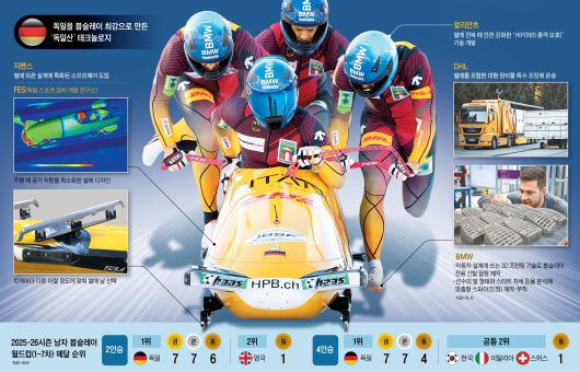 최고 시속 150㎞를 넘나들며 100분의 1초를 다투는 봅슬레이에서 독일의 힘은 기술력에서 나온다. 국가가 주도적으로 봅슬레이 관련 R&D(연구·개발)에 집중 투자한다. 여기에다 BMW·지멘스·알리안츠 같은 독일을 대표하는 글로벌 기업들이 봅슬레이 차체와 선수들의 장비 개발에 힘을 보태고 있다. 독일 팀의 썰매가 ‘메이드 인 저머니(Made In Germany)’ 기술력의 집약체라는 얘기가 과장이 아니다.