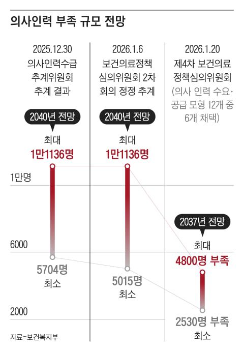 그런데 지난 20일 보정심 회의 때 2037년 기준 부족한 최대 의사 수를 7261명에서 4800명으로 또 줄였다. 정부 관계자는 “보정심 위원들 표결을 거쳐 추계위로부터 받았던 의사 인력 수요·공급 모형 12개를 6개로 줄이면서 최대값도 변하게 된 것”이라고 했다.