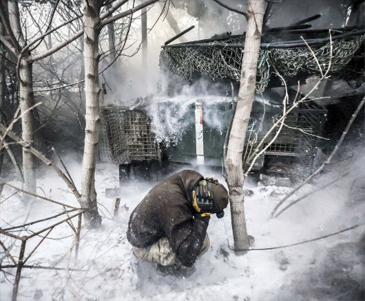 눈 속에서 포격전 지난 18일 우크라이나 도네츠크주의 숲속에서 러시아군 진지를 향해 자주곡사포를 발사한 우크라이나군 제24 기계화여단 소속 병사가 귀를 막고 웅크리고 있다. 다음 달 개전 4주년을 앞두고 우크라이나와 러시아 양측의 공방전이 격화되고 있다./EPA 연합뉴스 |