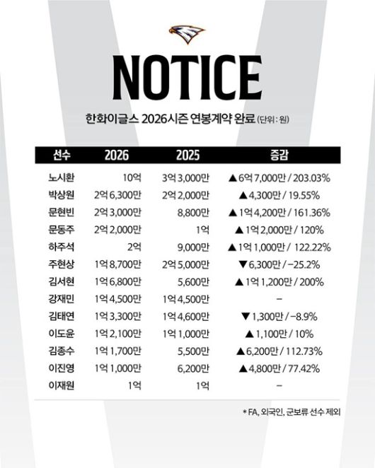한화 구단은 21일 2026시즌 연봉 재계약 대상 선수들과 계약을 마쳤다고 공식 발표했다.