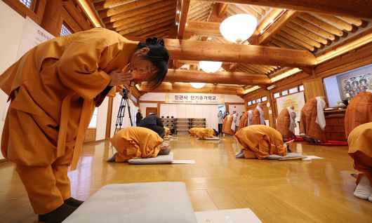 서울 은평구 진관사 함월당에서 진관사 제1기 단기출가학교 ‘한걸음’ 고불식(부처님께 고하는 의식)이 21일 봉행되고 있다. 대한불교조계종 총무원이 주최한 이번 행사에서는 10대부터 50대까지 다양한 연령대의 여성 입교자 11명이 108배 등 실제 출가자가 겪는 행자 과정을 수행할 예정이다. 남정탁 기자 ⓒ 세상을 보는 눈, 세계일보