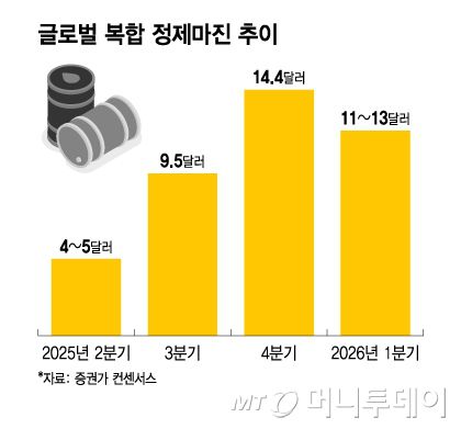 2026년 연간 전망은 사뭇 다르다. 세계 경제성장률 둔화에 따른 석유수요 감소 우려가 지속되고 고환율 기조까지 이어지면서 보수적인 시각이 우세하다. 미국의 관세압박, 미중 무역갈등, 중동지역 지정학적 리스크 등 복합적 요인으로 국제유가 하락압력도 커진다. 국제유가가 하락할 경우 원유 수입단가가 낮아지는 긍정적 효과가 있지만 동시에 석유제품 가격도 하락해 정제마진이 축소될 수 있다.