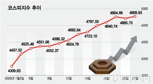 이날 코스피지수는 전거래일 대비 24.18포인트(0.49%) 오른 4909.93에 거래를 마쳤다. 종가 기준 사상 최고치다. 개장 직후 코스피는 전일 대비 약세로 출발해 장중 한때 4807.13(-1.61%)까지 밀려났으나 외국인의 매수세로 낙폭을 전부 만회하고 장중 4910.54까지 올랐다.