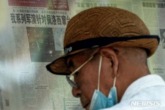 [베이징=AP/뉴시스]지난 2022년 8월 3일 중국 베이징의 신문 게시판에서 한 노인모습.