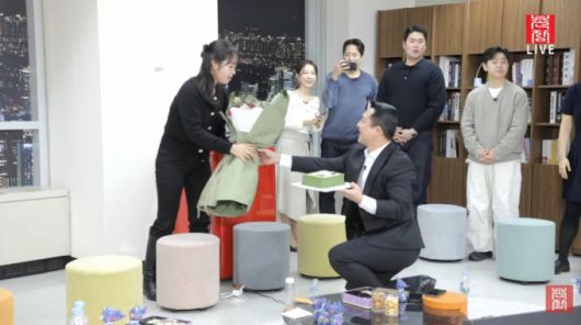 영철은 갑자기 자리를 비우고는 꽃다발과 케이크를 들고 나타났다.