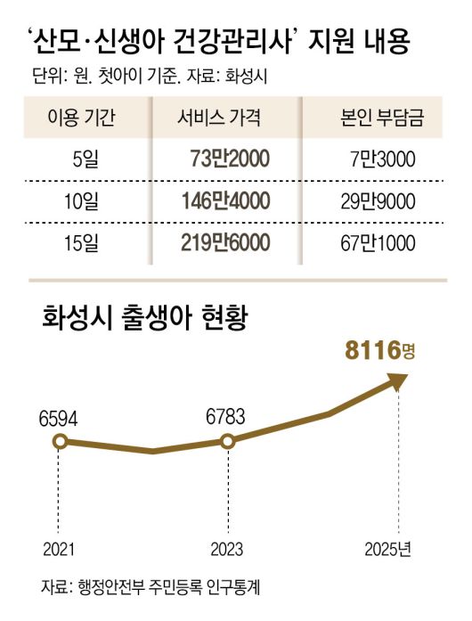 소득 기준을 없애 보편적 복지로 설계한 점도 특징이다. 산후조리원 이용 여부와 관계없이 신청할 수 있고 출산 예정일 40일 전부터 출산 후 60일 이내까지 신청 가능하다. 출산 형태와 자녀 수에 따라 최소 5일에서 최대 40일까지 서비스를 받을 수 있다. 이용 시간도 탄력적으로 조정 가능하다. 첫아이 기준 10일 이용 시 전체 비용 146만4000원 가운데 산모가 부담하는 금액은 29만9000원으로 나머지는 경기도와 화성시가 지원한다.