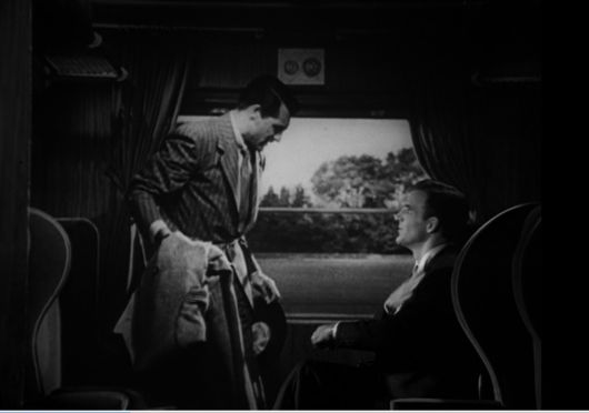 영화 ‘죽은 자는 체크무늬를 입지 않는다’에선 히치콕의 ‘의혹’(1941년) 속 장면을 차용해 새로운 장면으로 재구성했다. 릭비 역의 스티브 마틴(오른쪽)이 ‘의혹’ 속 조니 역의 케리 그랜트와 같은 열차 칸에 앉아 있는 것처럼 편집했다. 유니버설픽처스 제공