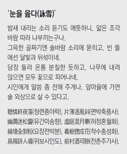 눈을 읊은 한시는 많지만 고려 임유정(林惟正)이 남긴 다음 작품은 시 쓰기 방식에서 우리의 눈길을 끈다.