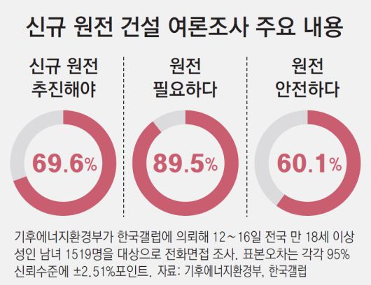 국민 여론은 원전 건설에 찬성하는 쪽이 압도적인 것으로 조사됐다. 기후에너지환경부가 한국갤럽과 리얼미터에 의뢰해 진행한 ‘미래 에너지 대국민 인식 조사’ 결과 11차 전기본에 담긴 신규 원전 건설 계획을 ‘추진해야 한다’는 응답은 갤럽이 69.6%, 리얼미터가 61.9%로 집계됐다. 국내에 원전이 필요하다는 응답은 80%(갤럽 89.5%, 리얼미터 82.0%)를 웃돌았고, 원전이 ‘안전하다’는 의견도 60%를 넘겼다.