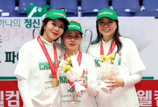 하나카드 김가영(왼쪽부터), 김진아, 사카이 아야코가 21일 팀 리그 파이널에서 최초의 2회 우승을 이룬 뒤 시상식에서 포즈를 취하고 있다. PBA