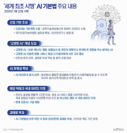 인공지능(AI)을 둘러싼 규제 논쟁이 거센 가운데, 정부가 '규제가 아닌 기본 틀'을 표방한 AI기본법이 22일부터 공식 시행된다.
