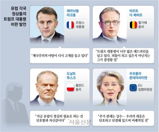 도날트 투스크 폴란드 총리는 이날 엑스(X)에 “지금 유럽이 절실히 필요로 하는 건 단호함과 자신감이다”라고 적었다. 우르줄라 폰데어라이엔 유럽연합(EU) 집행위원장은 연설에서 트럼프 대통령의 추가 관세 부과 계획을 “실수”라고 부르며 트럼프의 위협에 유럽은 ‘단호하고, 단결되고, 비례적인’ 대응을 할 것이라고 했다. 폰데어라이엔은 그린란드에 대한 대규모 투자도 약속했다.