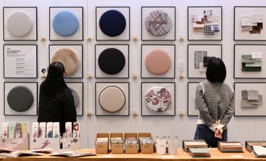 21일 서울 강남구 코엑스에서 열린 ‘2026 호텔페어’를 찾은 관람객들이 부스에 전시된 직물 소재 제품들을 살펴보고 있다. 23일까지 열리는 이번 전시에는 호텔 운영 솔루션을 비롯해 공간∙인테리어, 서비스, 어메니티, 스마트 솔루션 등 호텔∙숙박 산업 전 분야를 아우르는 기업들이 참가했다.