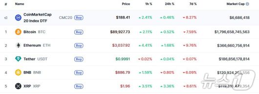 이 시각 현재 주요 암호화폐 시황 - 코인마켓캡 갈무리 |